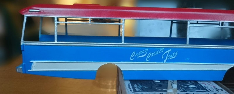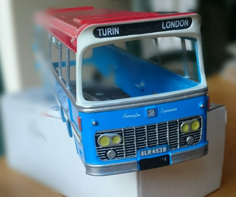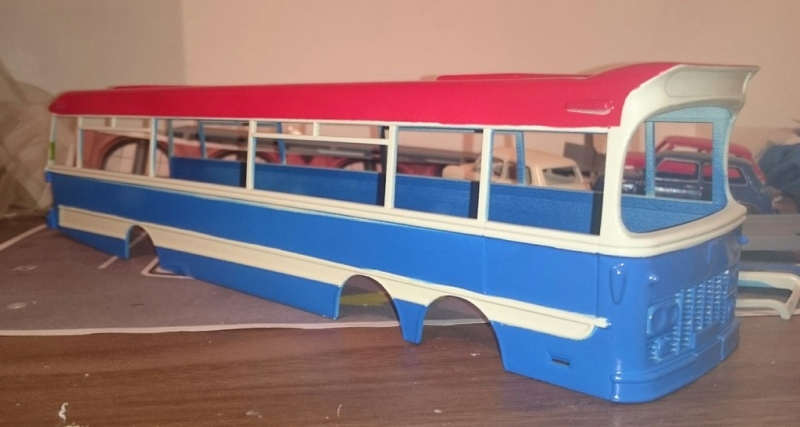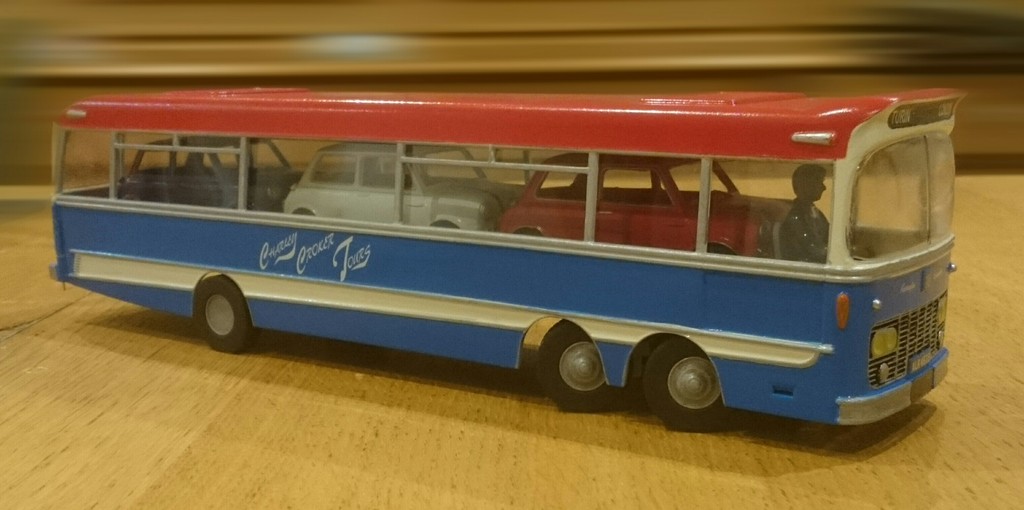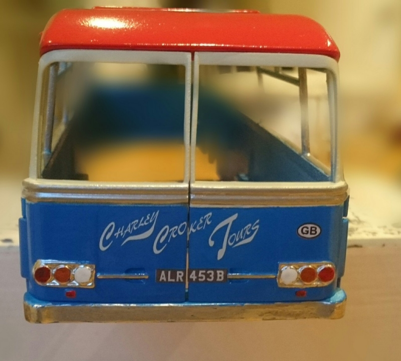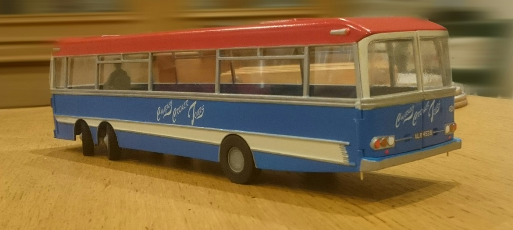 I like Volkswagen Pastel White but you can choose your own shade.  Then mask off the roof, the white sides and lay on a mid blue – I used Rover Pageant mid blue.  Then mask off everything but the roof and use a deep red, Vauxhall Carmine red was my choice.