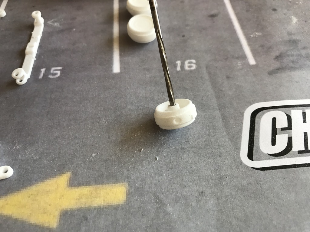 This should also be done already – clearance for the stub axles so they rotate freely.  A 2.4mm drill bit should be fine.