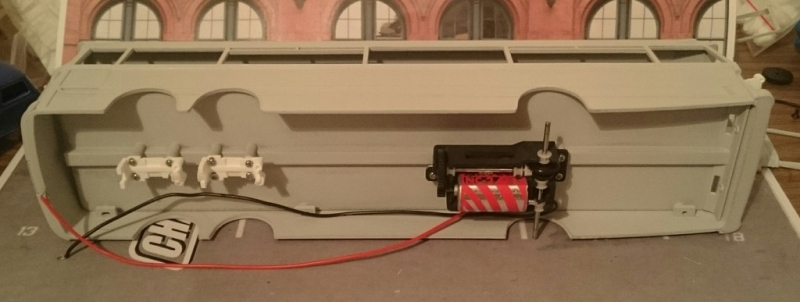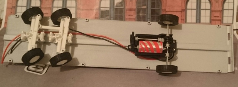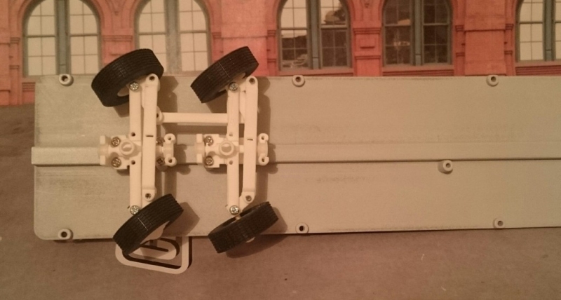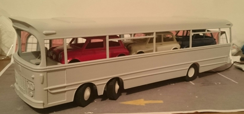 To get it to fit on a Scalextric track and still fit 3 Minis makes it a big vehicle, 340mm long and almost 80mm wide.  The structure is a 3D printed bodyshell with removable floor, this accommodates the steering systems, motor pod and of course give somewhere for the Minis to ride.