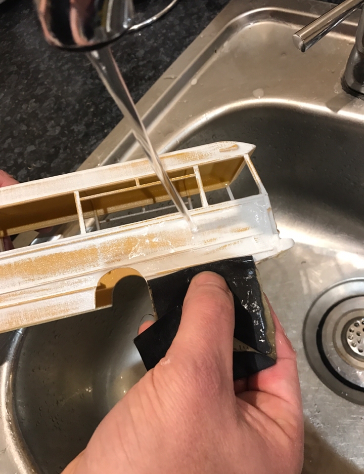 It needs a coat of white paint, sanding down and painting white again.  If you use wet and dry under a running tap it makes the paper last longer.  I use 400 grit on these parts which seems to work well.