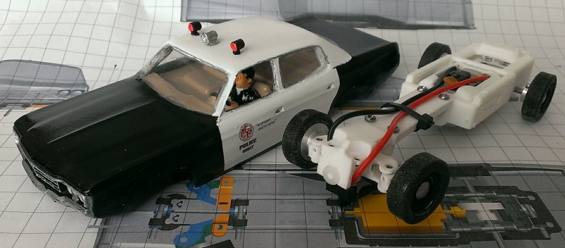 Next, the roof lights. To make them strong I use some 1mm brass bar to locate the lights & siren, and drill a hole in the roof. If you don’t crash much you can just glue them in place.
