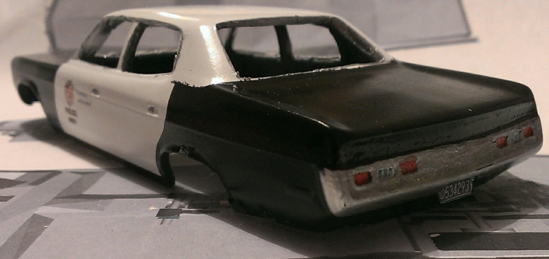 This car is white over black, so first I used white primer, then white gloss paint. I then masked off the top and used grey primer with black gloss paint.